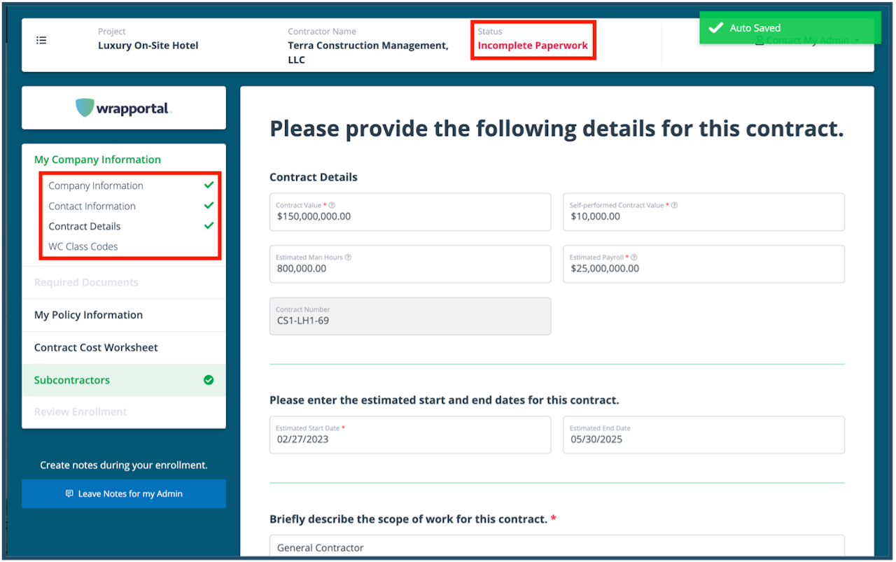 Once you begin completing the enrollment paperwork, your contract status will change from “Assigned” to “Incomplete Paperwork”. A green check will appear next to each page on the left menu once you complete all required information and move to the next screen.