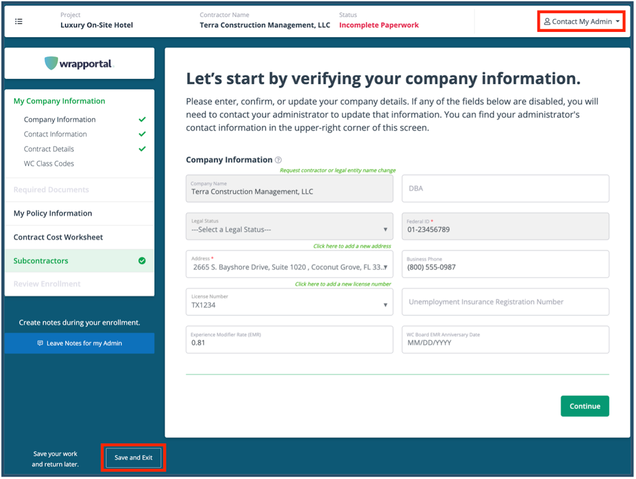 You can exit your enrollment forms at any point using the “Save and Exit” button on the bottom left of each enrollment page. All your information will be saved, and you can pick up where you left off when you return.