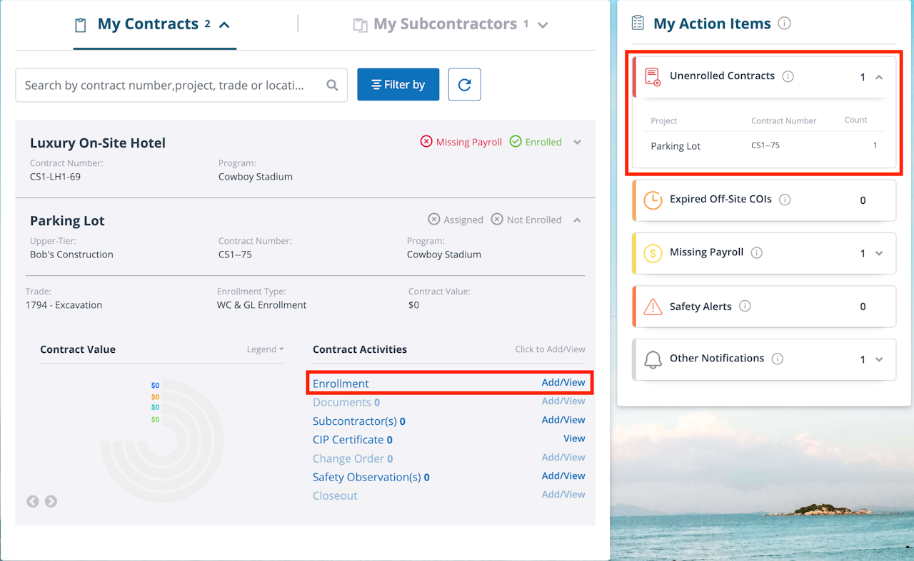 To begin the enrollment process for a contract, click on the “Unenrolled Contracts” section of your “My Action Items” on the My Contracts tab or on the Dashboard tab. Any contracts that need the enrollment forms completed will appear in the list under the category heading. Click on a contract from the list to open the enrollment pages for the contract.