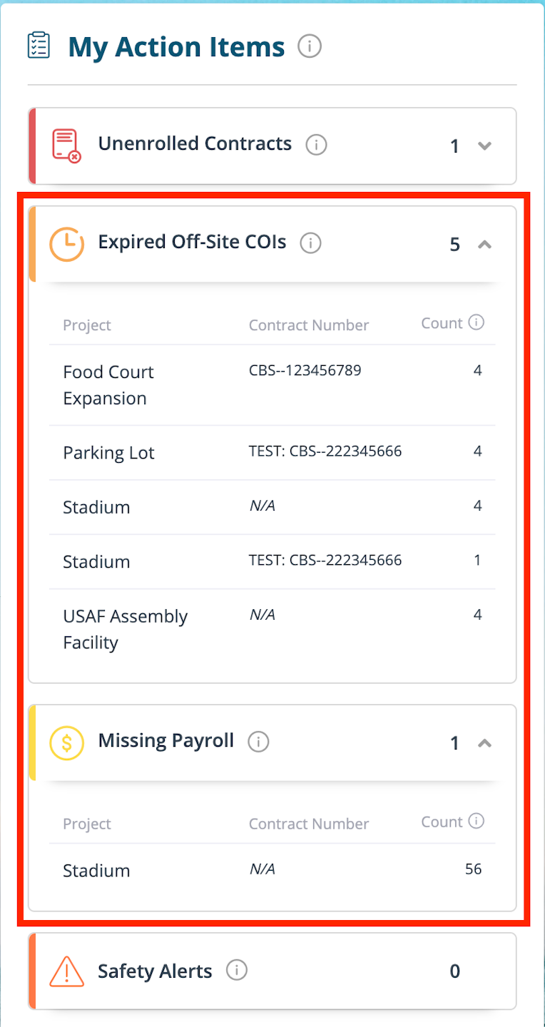 The compliance alert displays next to the contract status on your list of contracts. In cases where more than one compliance alert applies, one alert will display on the contract list, but the contract will also be listed in all applicable categories in your "My Action Items".