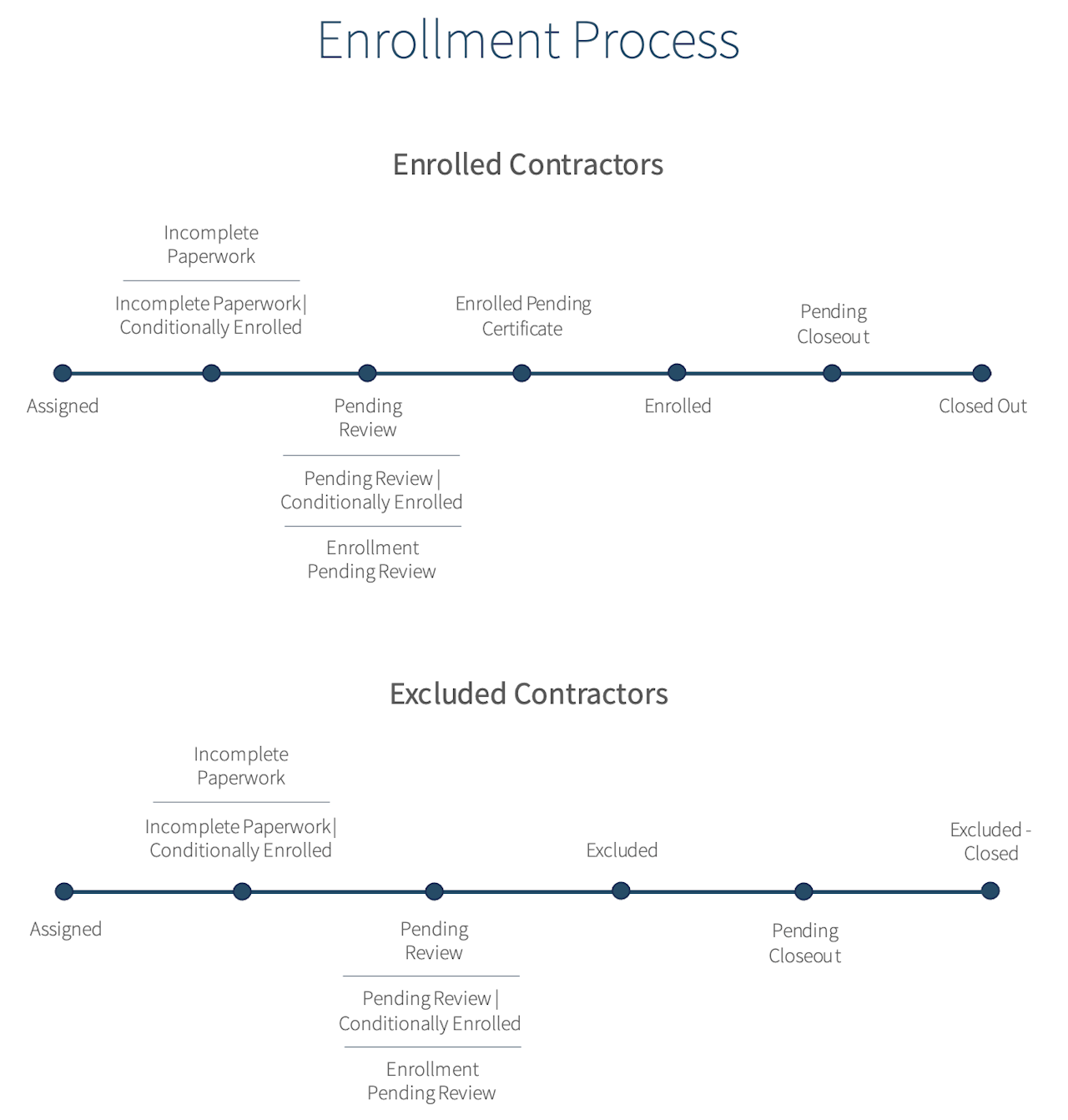 Enrollment statuses refer to the progression of a contract from being assigned, to enrolling into the CIP, to being closed out.