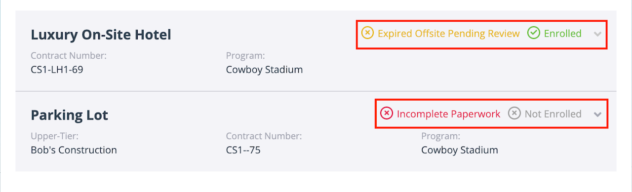 There are two types of statuses assigned to contracts - enrollment statuses and compliance statuses.