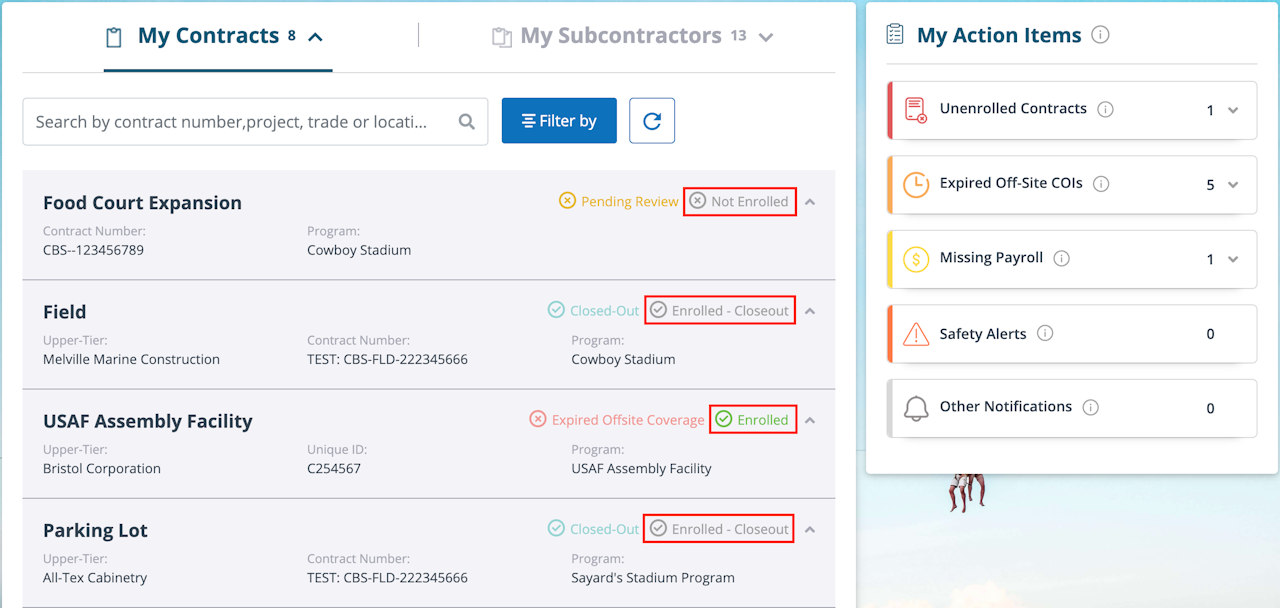Enrolled – This status is used when all enrollment forms have been completed, the administrator has confirmed them, and has generated a CIP certificate for the contract. Contracts in this status are enrolled into the CIP, and contractors are allowed on the jobsite.