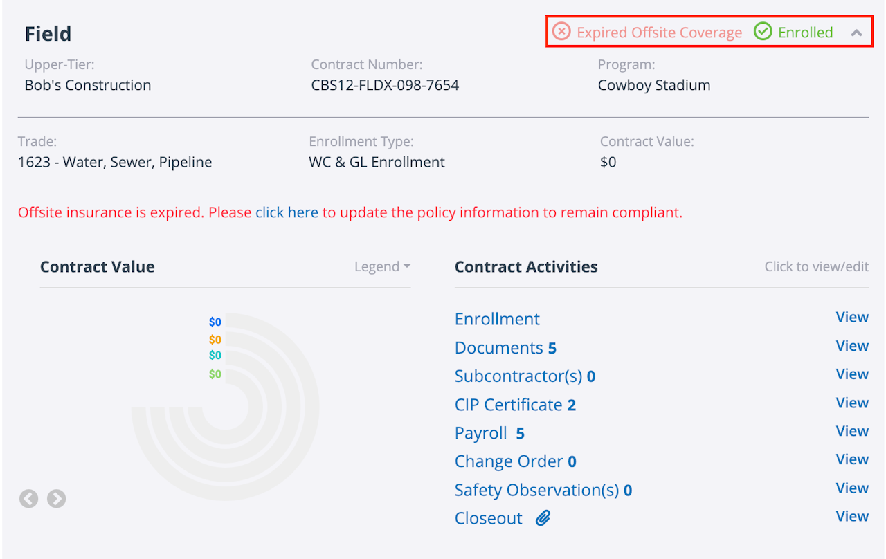 Expired Offsite Coverage – This status is used when at least one of the non-CIP policies on a contract has expired.