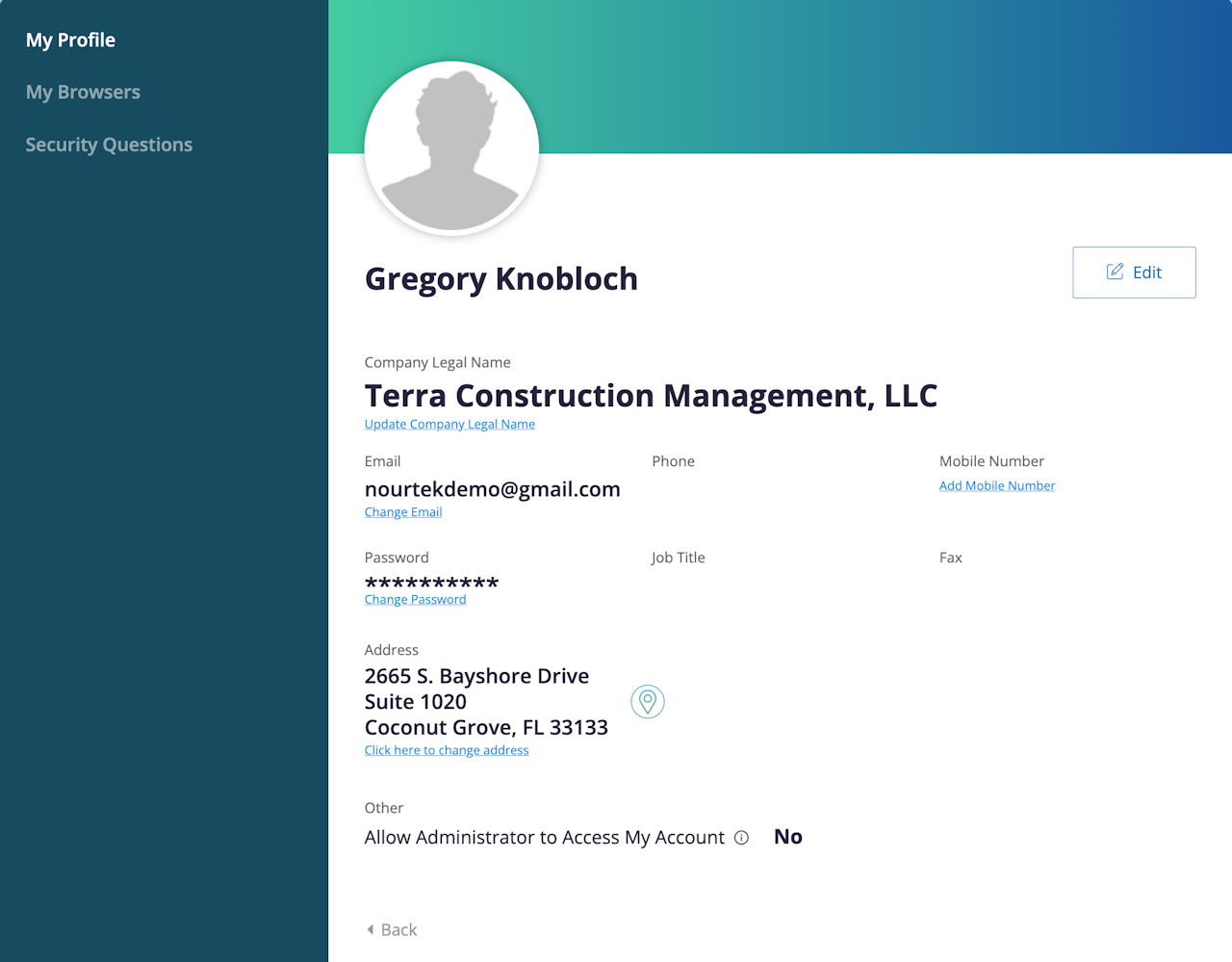 The “My Profile” tab is where your company information is located. You can make edits to your company and contact information here.