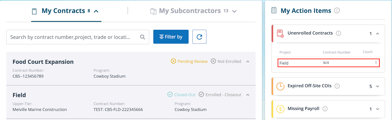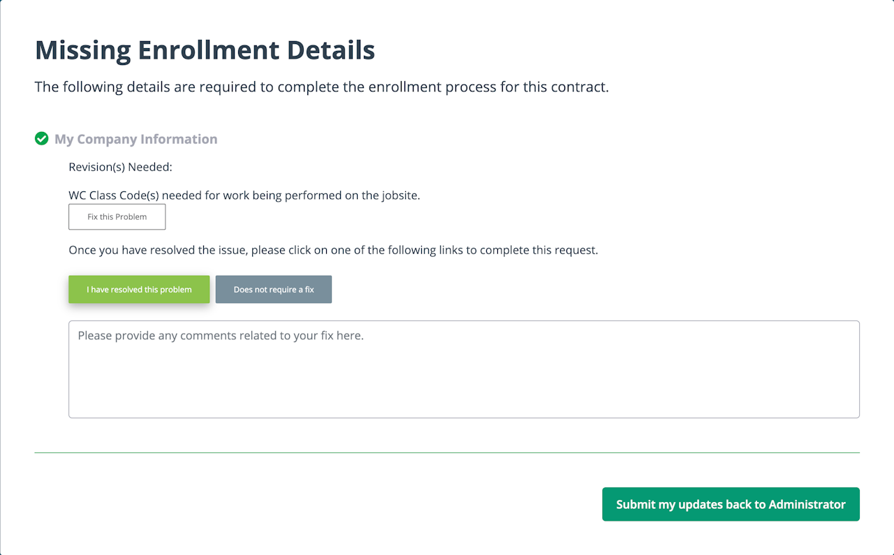 If your administrator marks any of your enrollment pages or any of your required documents as incomplete, the contract will change back to "Incomplete Paperwork" status and will reappear in the “Incomplete Enrollments” category of your “My Action Items”. You will also receive an email from your administrator that identifies what is missing.