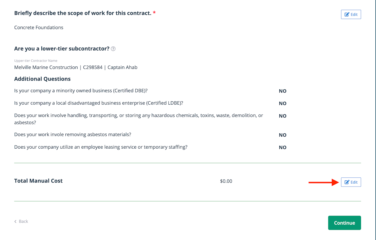 Scroll to the area on the summary page that contains the information needing updates. Then click the “Edit” button to open the form.