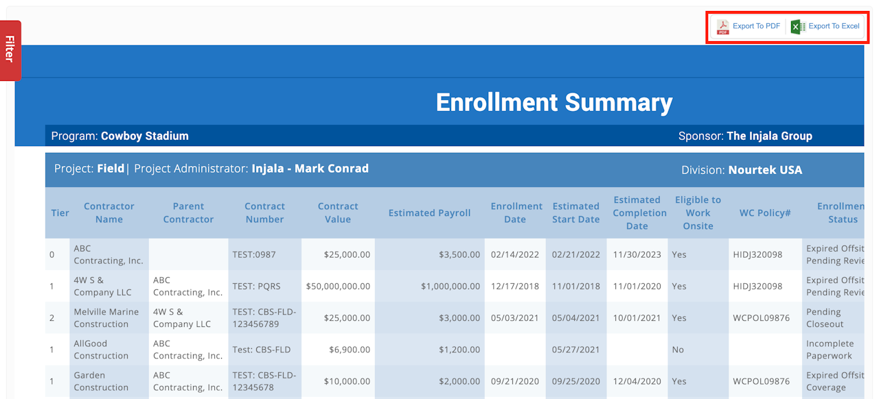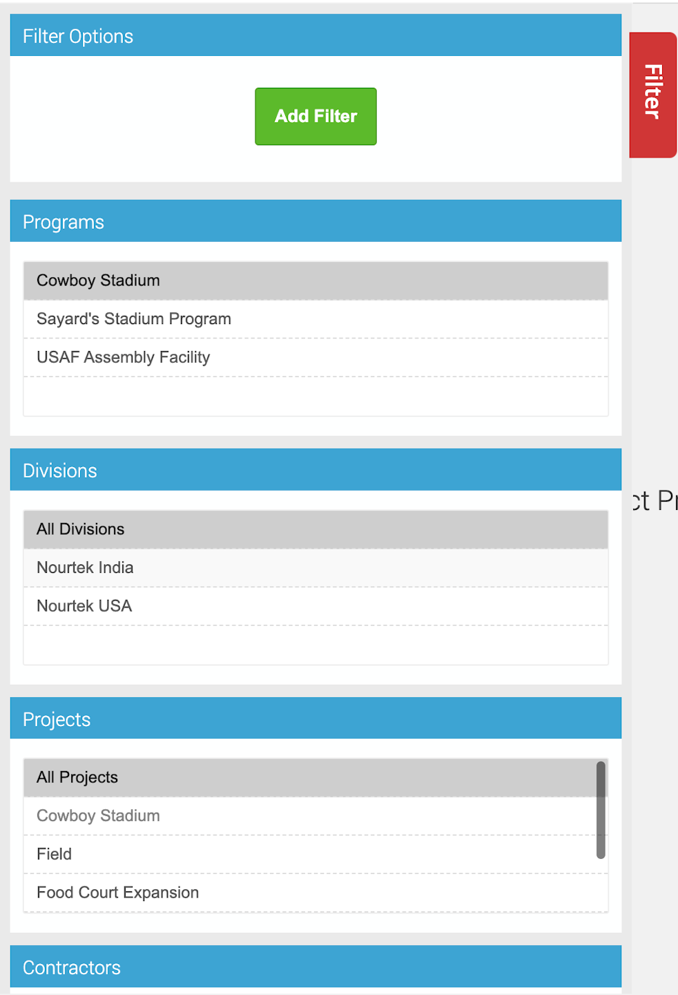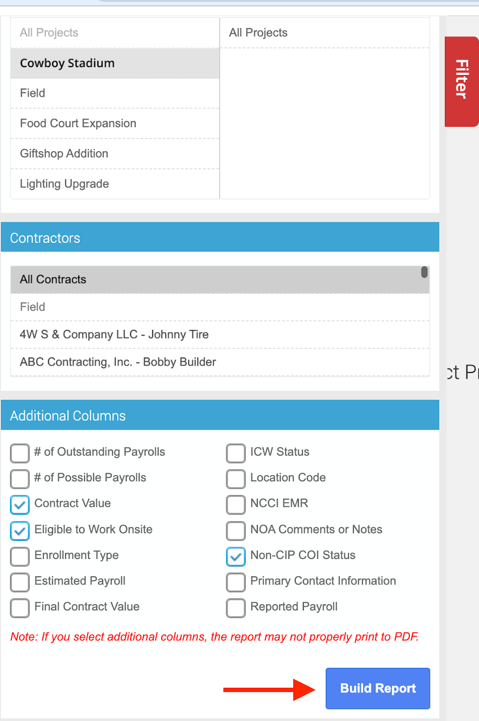 Use the other filters to identify the projects and contractors to include on the report. These filters are set to “All Projects” and “All Contractors” by default. Additional filter options, such as the division or additional column options, may be available in the filter drawer depending on the program and report that was selected.