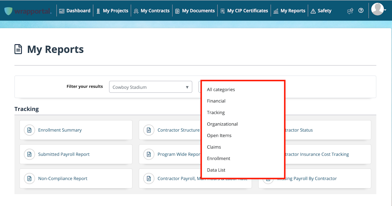 The reports are organized by category, such as tracking or financial reports, and can be filtered by category.