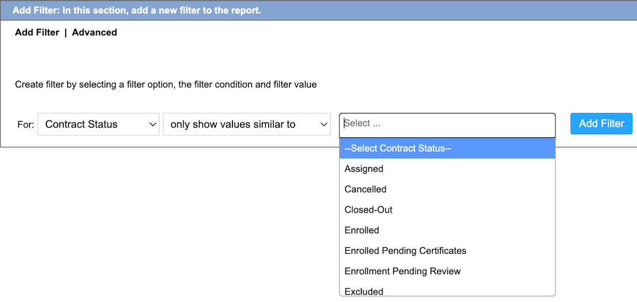 Some reports have an “Add Filter” button at the top of the filter drawer to refine the results that will pull into the report. The filter options vary by the type of report being run, but may include filtering options such as Contract Status, Enrollment Type, etc.