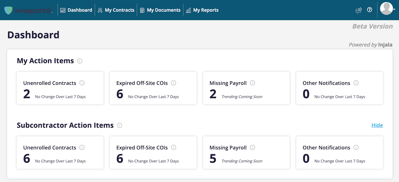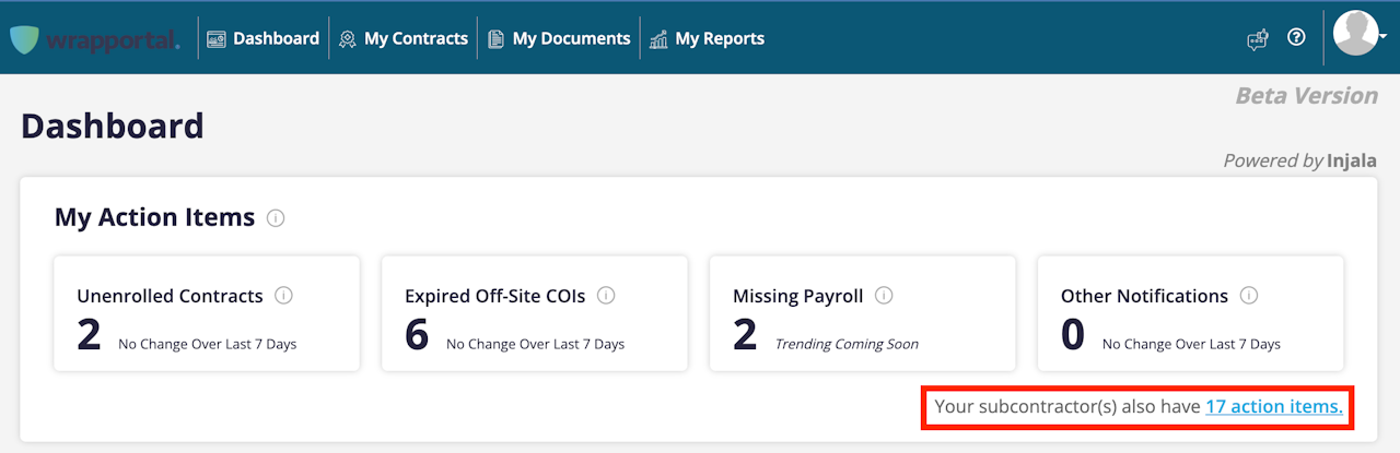 If you have any subcontractors on your contract, and if any of the subcontractors have pending action items, a line of text will appear under your action items categories with a count of the total outstanding action items your subcontractors have.