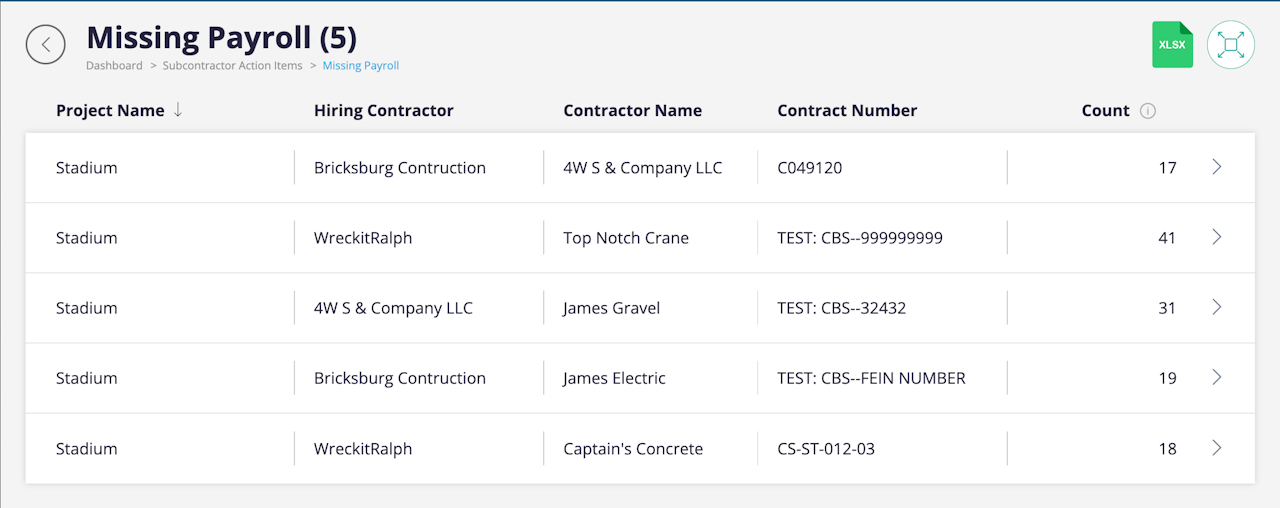 The “Subcontractor Action Items” works in the same way as your own action items. Simply click on a category to view the list of subcontractor contracts with pending items in the category.