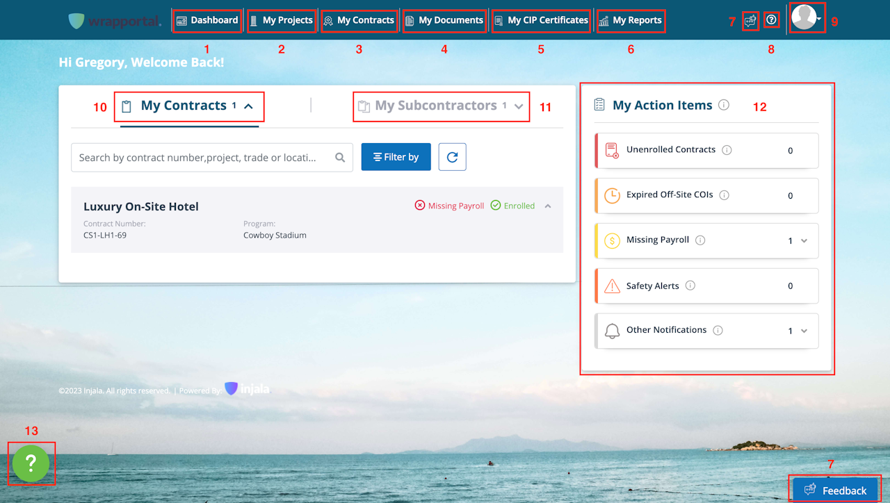 Feedback - A feedback button is available at both the top and bottom of the screen. Use this feature to provide feedback about your experience using the contractor portal. All feedback is reviewed and considered when making improvements to the system.