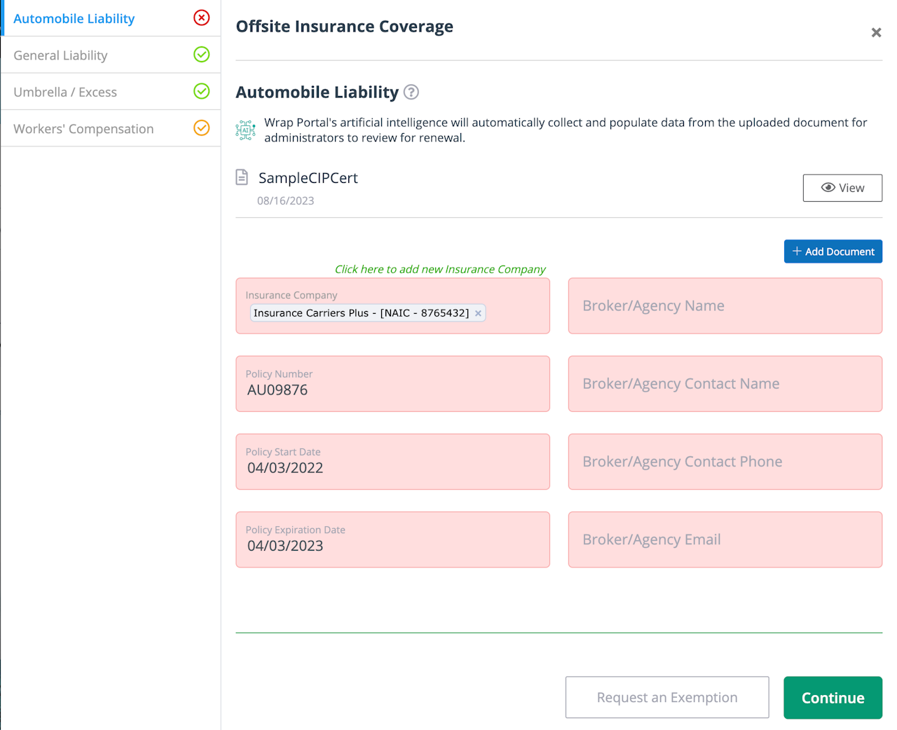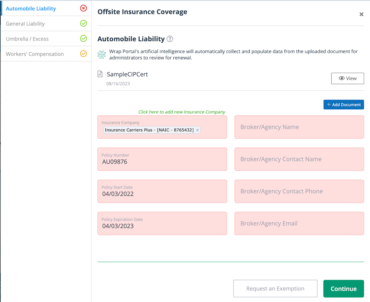 If your administrator has activated the artificial intelligence (AI) feature, the Certificate of Insurance (COI) will be read by the system’s AI when you upload the document. The AI will populate the fields in the enrollment form with the data from the document. If the AI is activated, there will be a blue AI icon along with a message about the AI function below the policy coverage name.