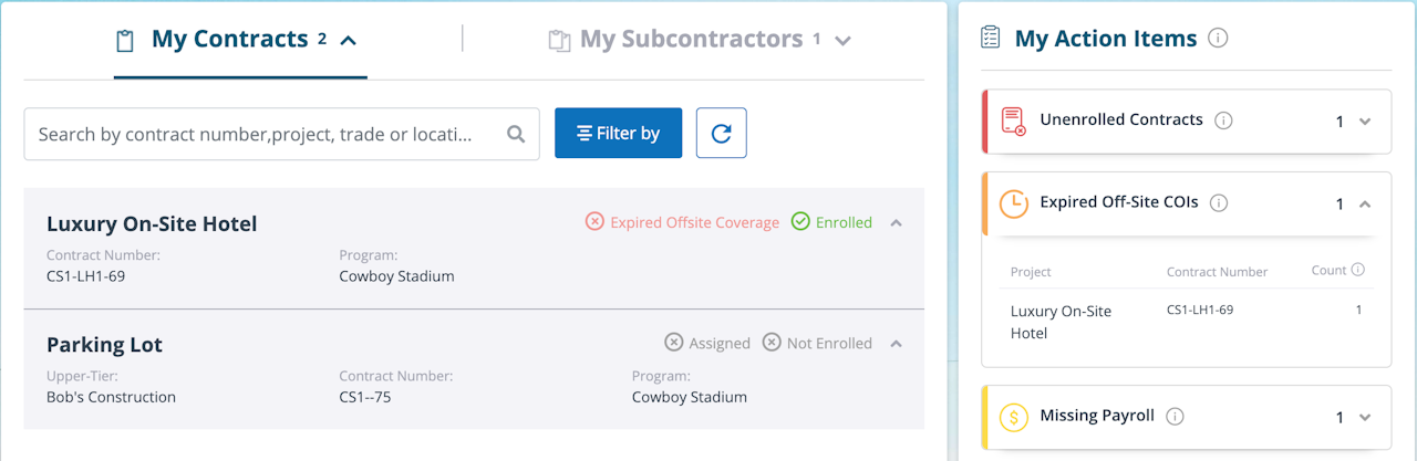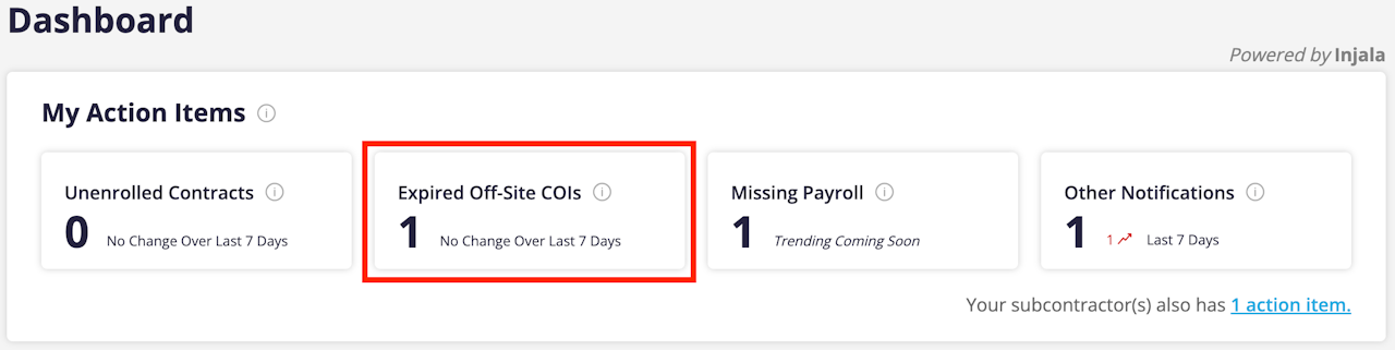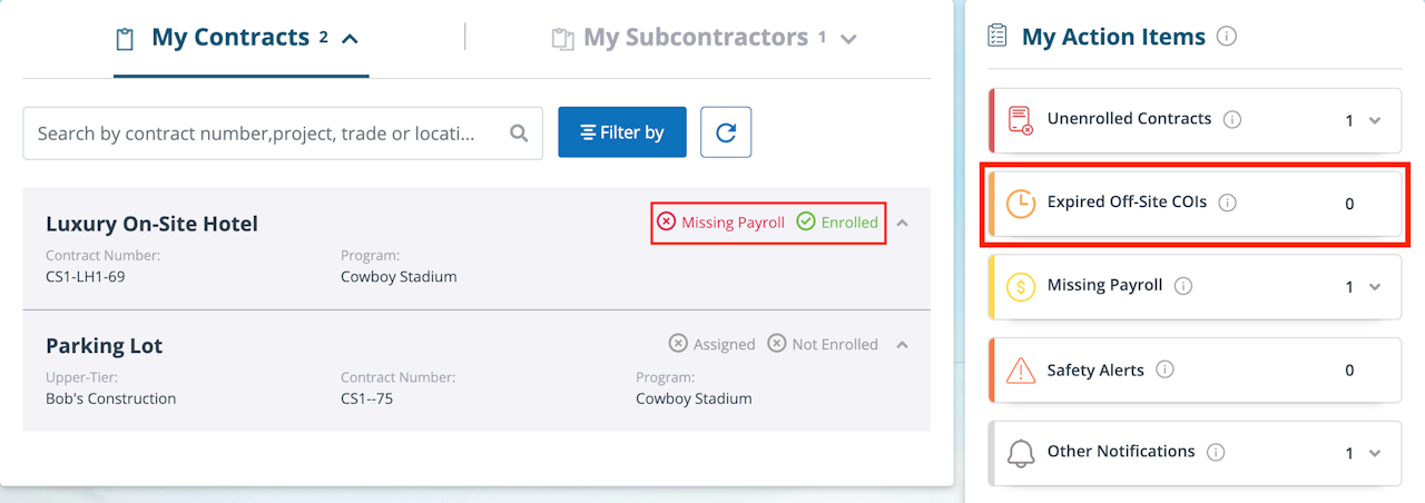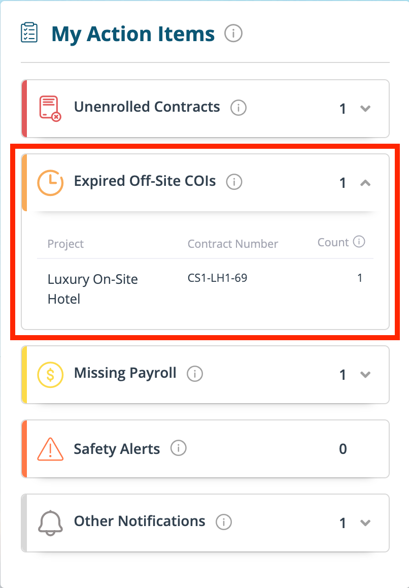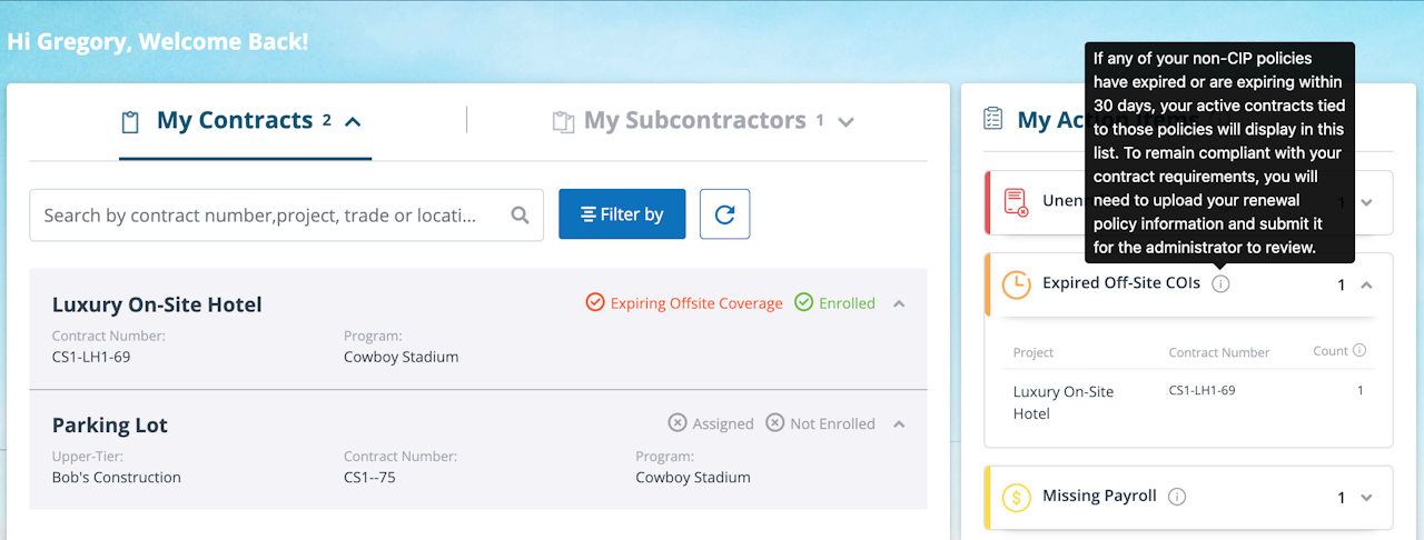 The contracts that have expiring or expired non-CIP policies will be listed in the "Expired Offsite COIs" section of the “My Action Items” on the Dashboard or on the "My Contracts" tab.
