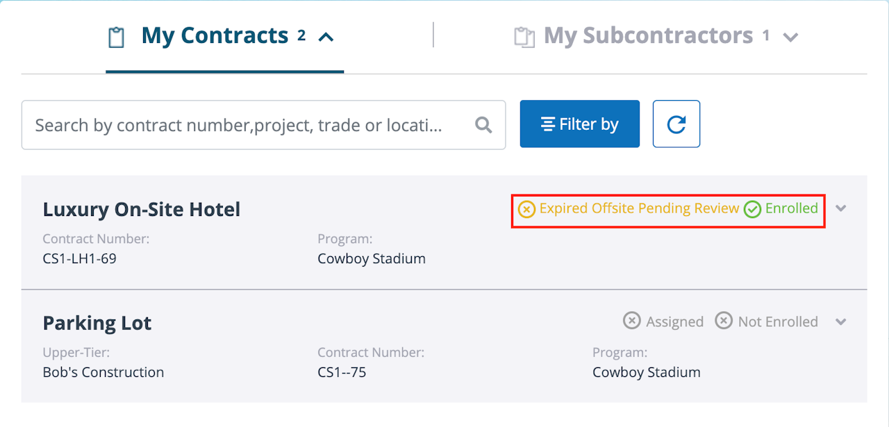 Your contract will be in “Expired Offsite Pending Review” status until the administrator reviews and confirms your renewal information.