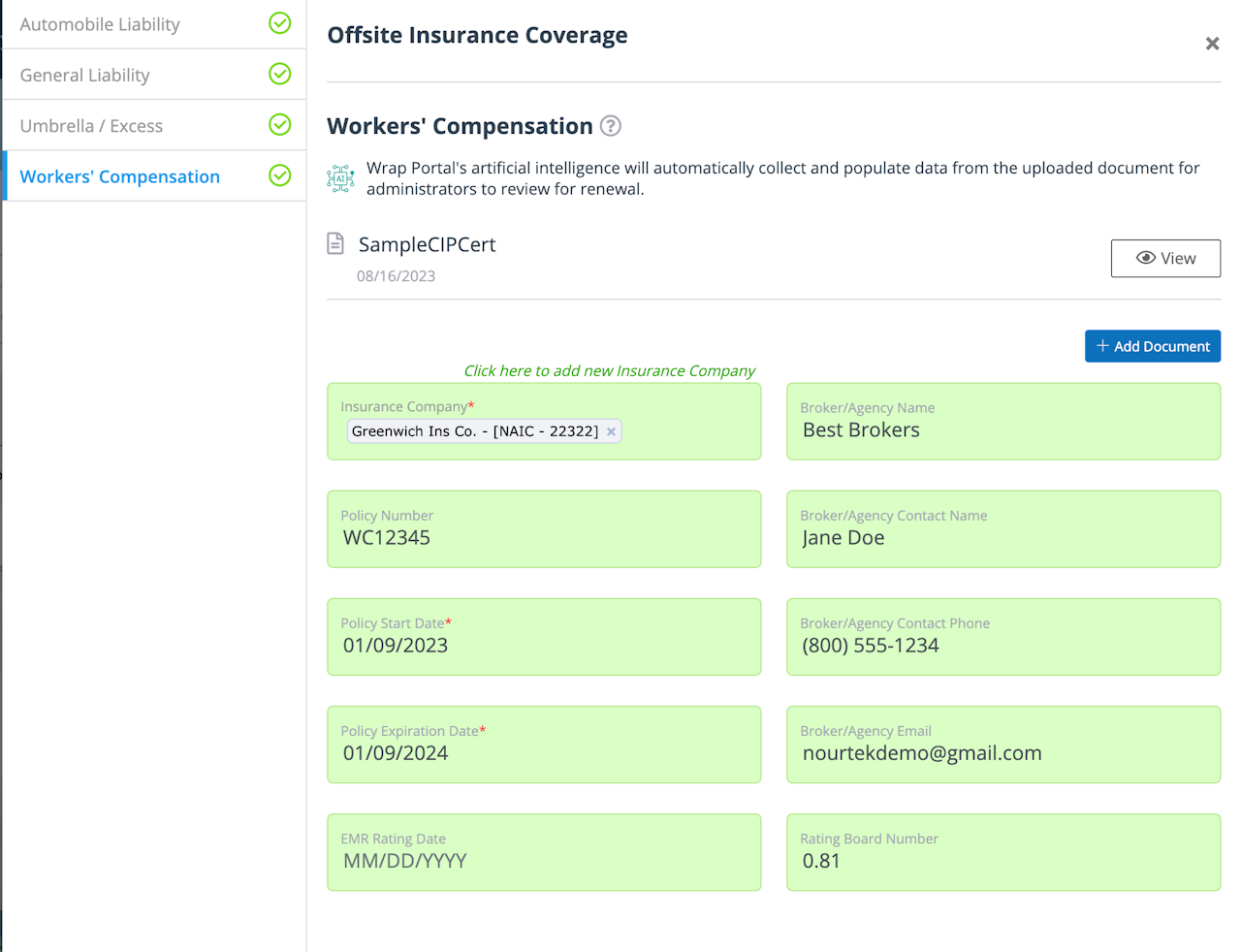 Upload the renewal certificate using the “+ Add Document” button. The system will ask if the document you are uploading includes any of the other policies needed. If so, select “Yes” for each applicable policy and save the page.