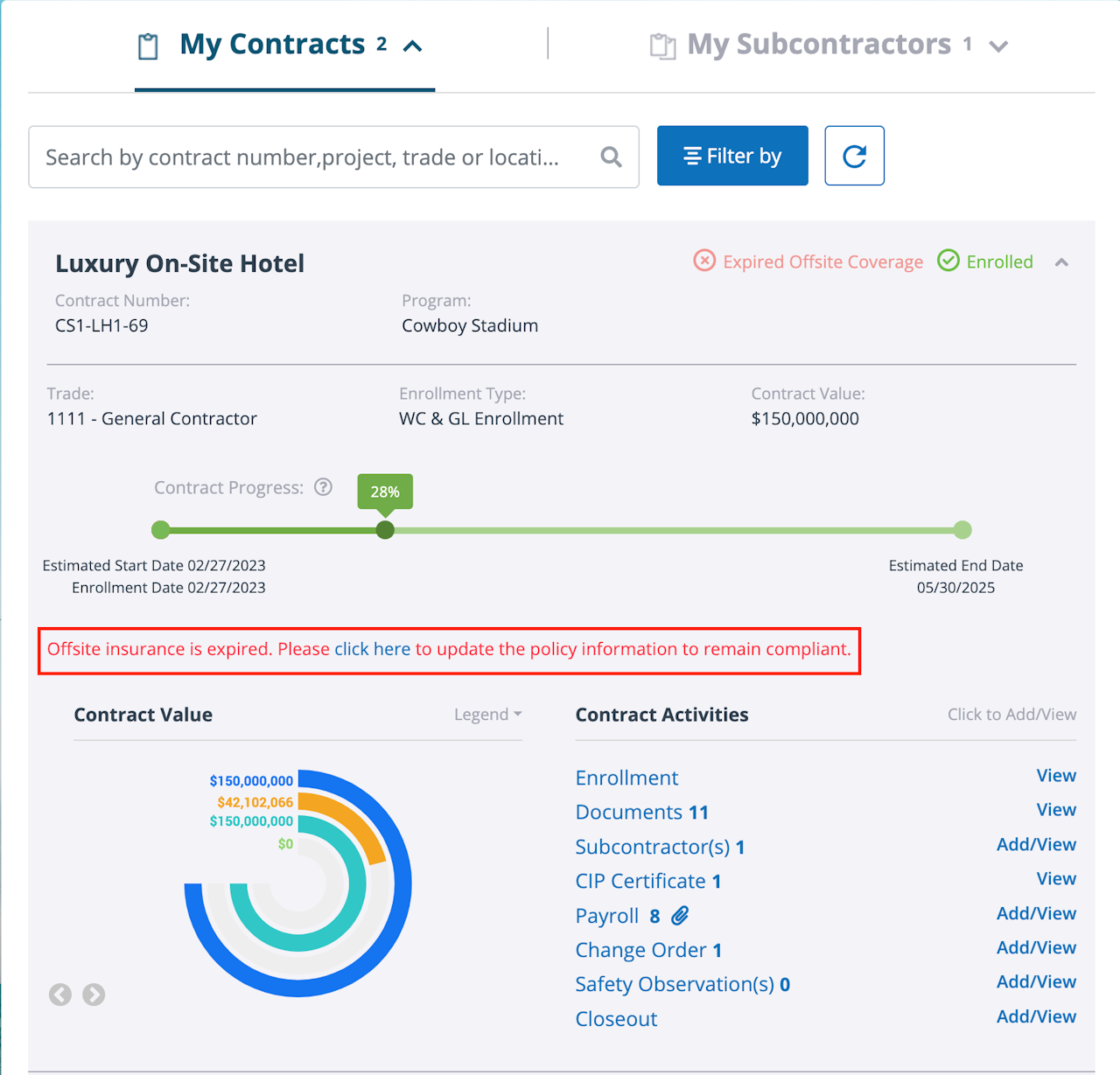 When one or more of your policies is within 30 days of expiration, your contract status will change to “Expiring Offsite Coverage”. If the administrator has email automations turned on, you will also receive an email notification reminding you to upload your renewal certificate(s).