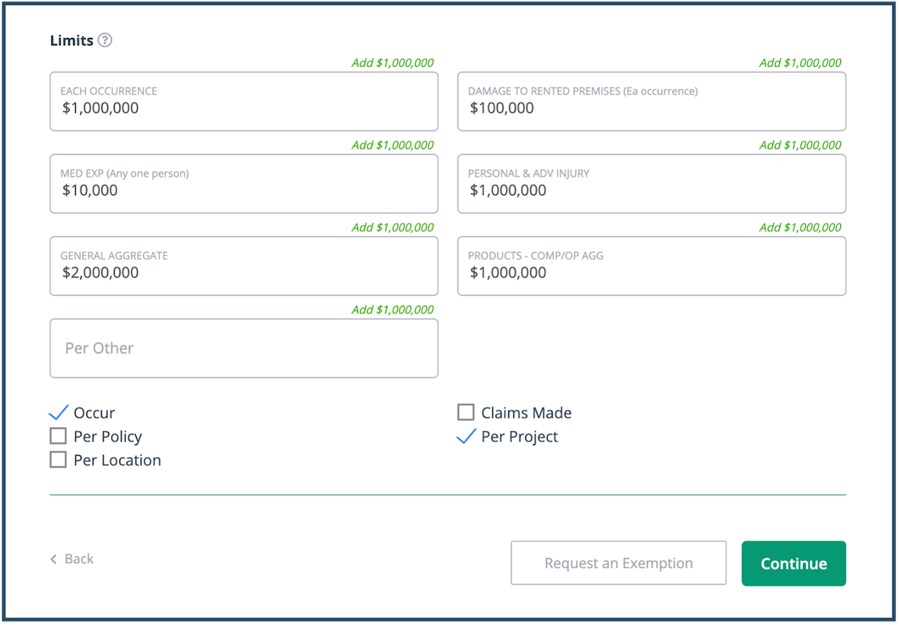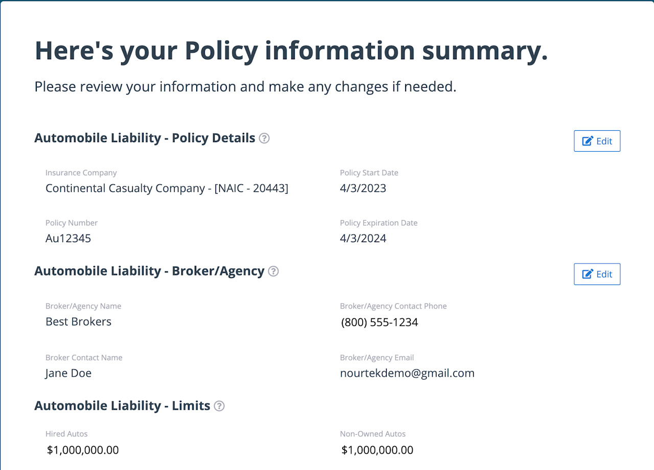 If the artificial intelligence was activated for the Certificate of Insurance (COI) document, the fields should have already been populated with your policy information when you uploaded the document. You simply need to review the prefilled information for each coverage type for accuracy. Make any changes, if needed, then continue to the next section.