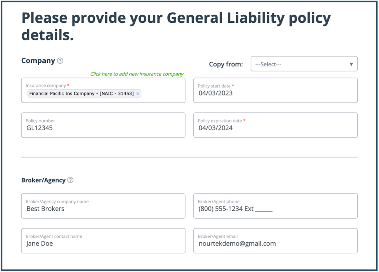 If the AI is not activated, you will manually enter the information from your COI. Work through each policy page of the section, entering the policy information. You will enter the insurance company, policy information, and broker information (if available) on each policy page.