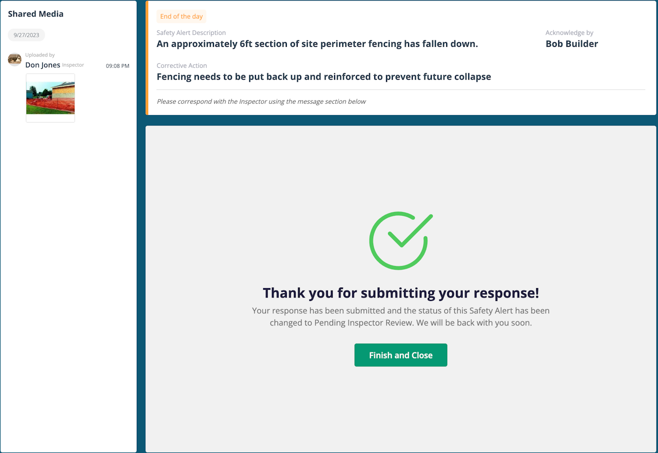 The status of the safety alert will change to “Pending Inspector Review”.