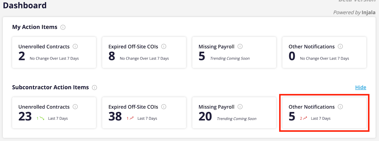 If safety inspections are being tracked in the system, then any safety alerts for inspection violations will appear in the “Other Notifications” category on the Dashboard. You will also have an additional tab at the top of the page called “Safety”.