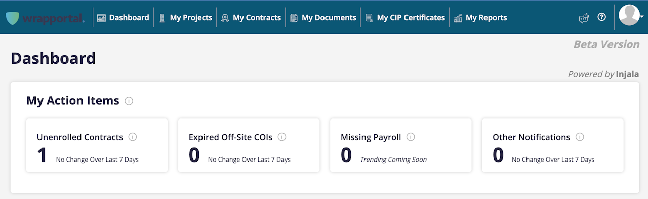 The “My Action Items” feature provides quick access to any open tasks you need to complete for your contracts. They are divided into 4 categories: Unenrolled Contracts, Expired Off-Site COIs, Missing Payroll, and Other Notifications. This feature only appears for general contractors and subcontractors. Sponsors/owners will not see the “My Action Items” section.